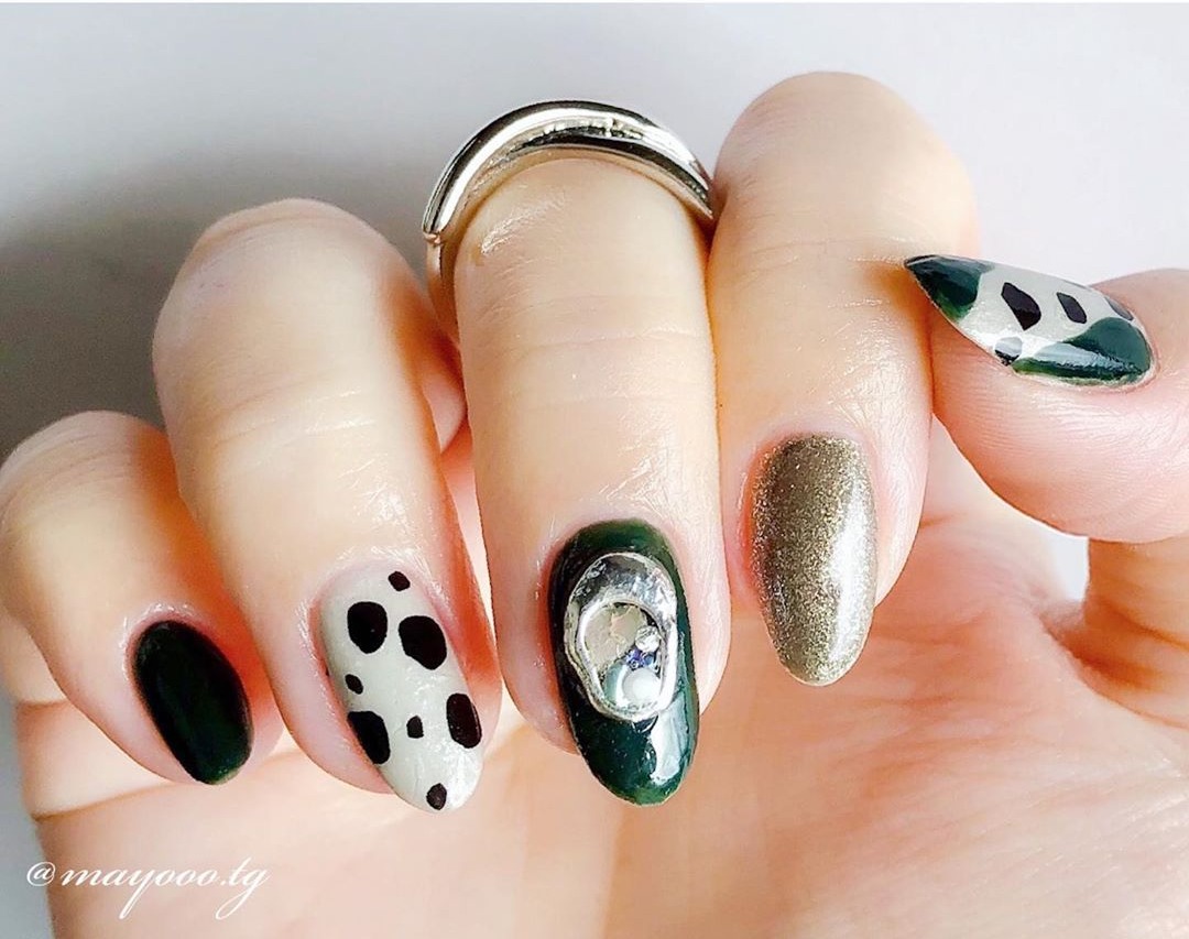 ダークグリーン×アニマル柄のネイルなら、クールでかっこいい大人女子の雰囲気に☆中指には、変形パーツ・シェル・パール・クリスタルストーンを組み合わせているんだとか。難しそうに見えるアニマル柄ですが、@mayooo.tgさんはネイルシールで仕上げたそうですよ!「自分でネイルアートはできない…」という初心者さんには、手軽に高見えデザインに仕上がるネイルシールはおすすめです。