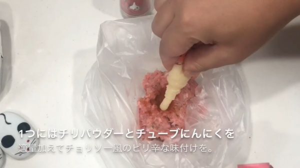 今回はタネを3等分しアレンジも加えることに。1つはチリパウダーとチューブにんにくでチョリソー風、もう1つはチューブにんにく少々にブラックペッパーを強めに効かせます。
