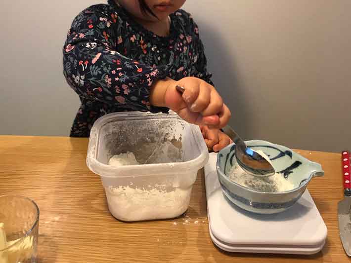 「では、材料を量りましょう!」というと、「うん!やる!」と、とってもいいお返事をいただきました。