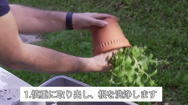 2. 慎重に取り出し、根っこ部分を洗浄します。