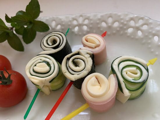 片手で食べられるお手軽メニュー。ピックを工夫すれば見た目もかわいらしくなる材料:スライスチーズ、好みの具材(ハム、キュウリ、のりなど)