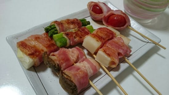 野菜や餅などの具材をベーコンで巻いて焼くだけ。下味をつけなくても塩味が加わって、ビールやチューハイにぴったりのおつまみになります。