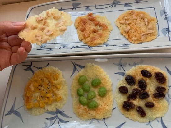 レンジで1分、簡単お手軽メニュー材料:加熱用チーズ、好きなトッピング具材(写真はコーン、冷凍枝豆、レーズン、マカデミアナッツ、柿の種のあられとピーナツ)