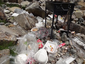 今年は、新型コロナウイルス感染拡大の影響か、7月のバーベキュー件数は例年より少なかったという。しかし、8月最初の日曜(2日)は、六つのグループがバーベキューをしていた。和田地区では20人くらいの若者が集まり、巡回中の職員が注意すると、いったん火を消したが、離れると再び始めていたという。翌日には、焼き肉のトレーや空き缶、ペットボトルのほか、食材を買ったとみられるスーパーのカゴまで捨てられていた。