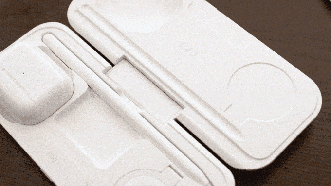 MOMAX airboxは、本体にAirpodsを収納しながら充電することができます。内側のライトニング端子にAirpodsの充電ケースを置くことで充電開始されます。