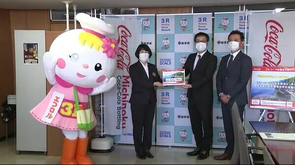2社では6月から8月まで店頭でキャンペーンを実施し、この期間に売れたペットボトル飲料の売り上げの一部11万円あまりを海洋ゴミの対策のため県に寄付した。