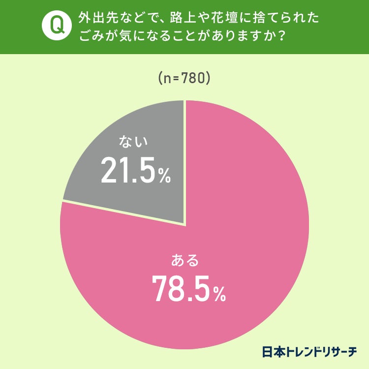 外出先などで、路上や花壇に捨てられたごみについて、78.5%の方が気になることが「ある」と回答しました。