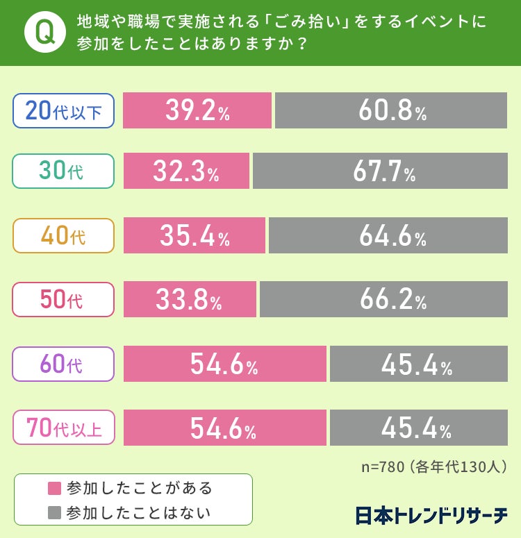 ◆60代と70代以上の半数以上が、ごみ拾いをするイベントに「参加したことがある」