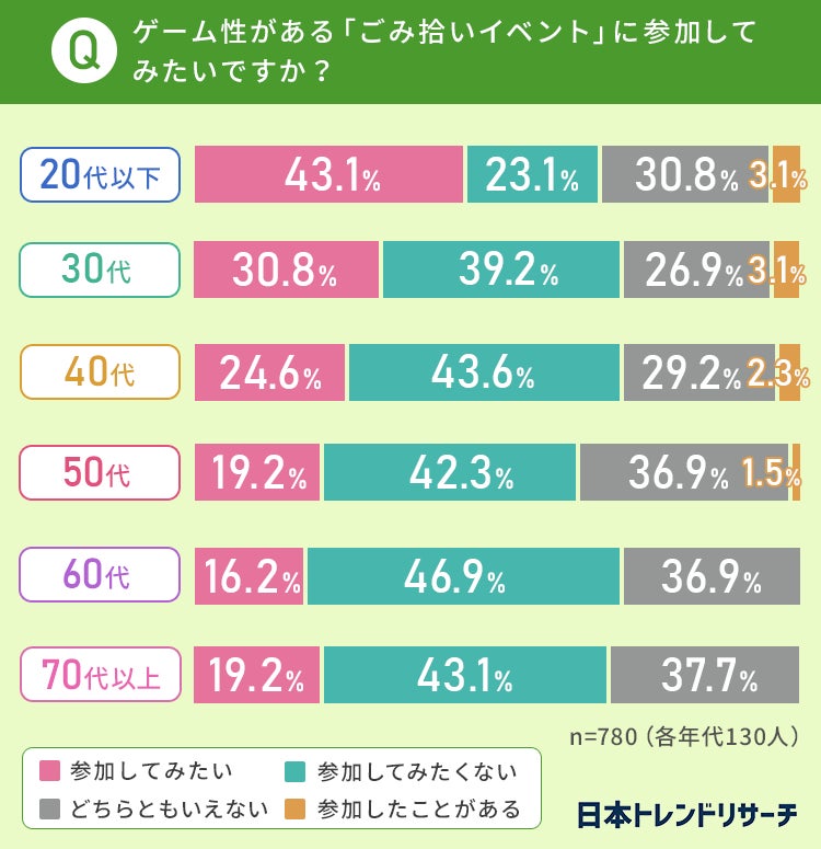 ◆20代の43.1%が、ゲーム性のあるごみ拾いイベントに「参加してみたい」