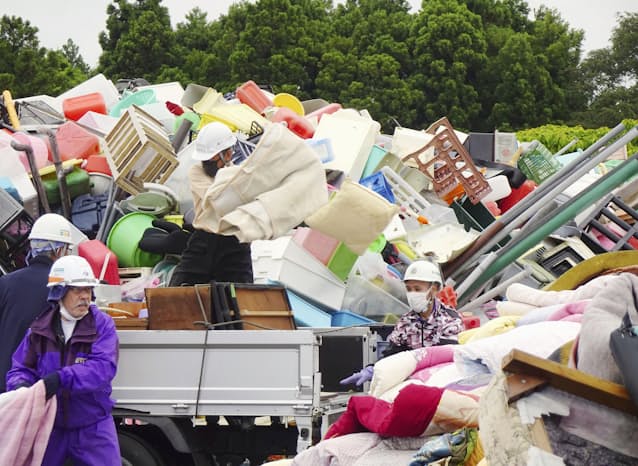 福島県では6月中旬もなお、各地で災害ごみの搬入が続く。週末の12日、相馬市内の集積場。外壁が崩れた実家2階部分の解体を決め、家財を運び込んだ同市の会社員(52)は「災害はまだ終わっていない」とつぶやいた。