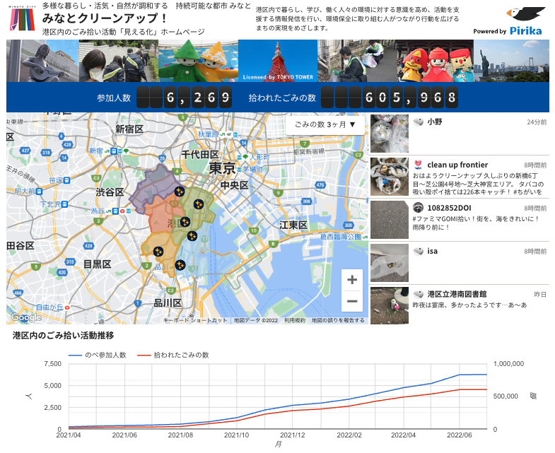 これらのデータを活用して、自治体の清掃・地域美化活動を促進するべく、現在、自治体ごとに切り出してウェブ上で視覚的に表示する「ピリカ自治体版 見える化ページ」の導入が広がっています。清掃活動に参加する企業・団体一覧、ごみ拾いの実績をランキングやマップで見ることができ、データによって必要な清掃箇所の洗い出し等にも活用されています。