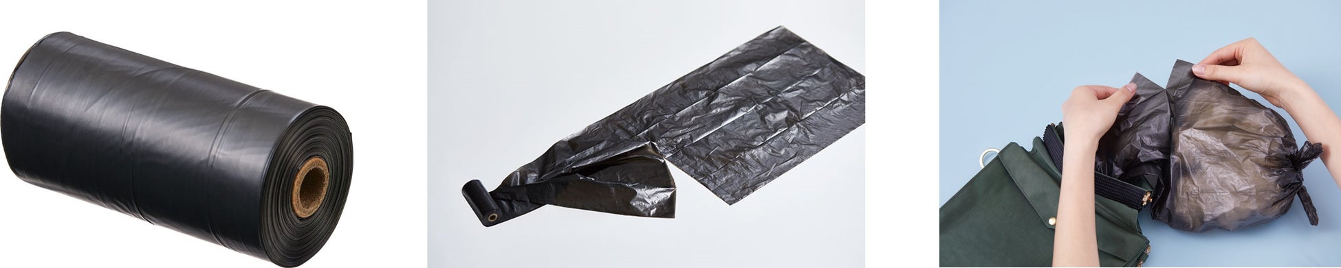 付属のごみ袋はコンパクトなロール形状で、バッグの底に入れて引き出すだけで簡単にセットでき、ミシン目に