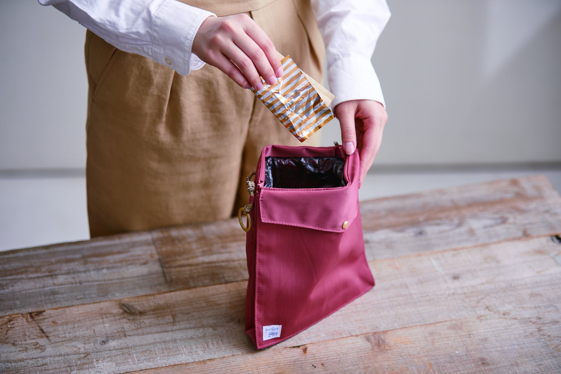 「ホルポ」は内側に専用のごみ袋がセットできる、持ち歩きに便利なポーチ型のごみ箱です。外出先で出るちょ