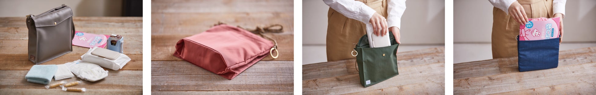 カジュアルなナイロンタイプはネイビー、ピンク、カーキ、クロの 4 色展開。シックなレザー調タイプはグレーの 1 色展開です。